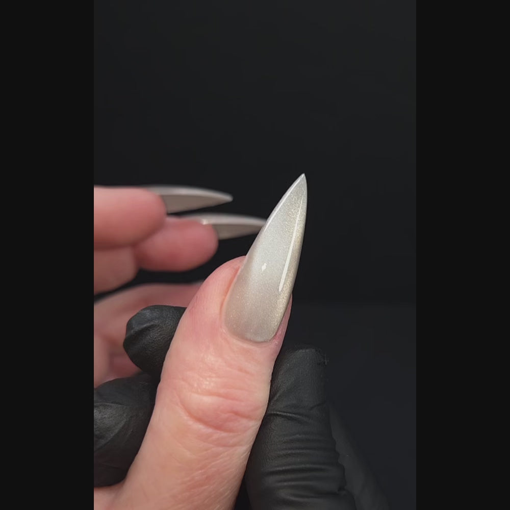 Twelve magnetic metallics designed for dimension and depth. Each shade reacts instantly to a magnet, creating a fluid line of light that shifts with every angle. The finish is smooth, reflective, and refined. Perfect for nail artists who want precision and movement in one stroke.